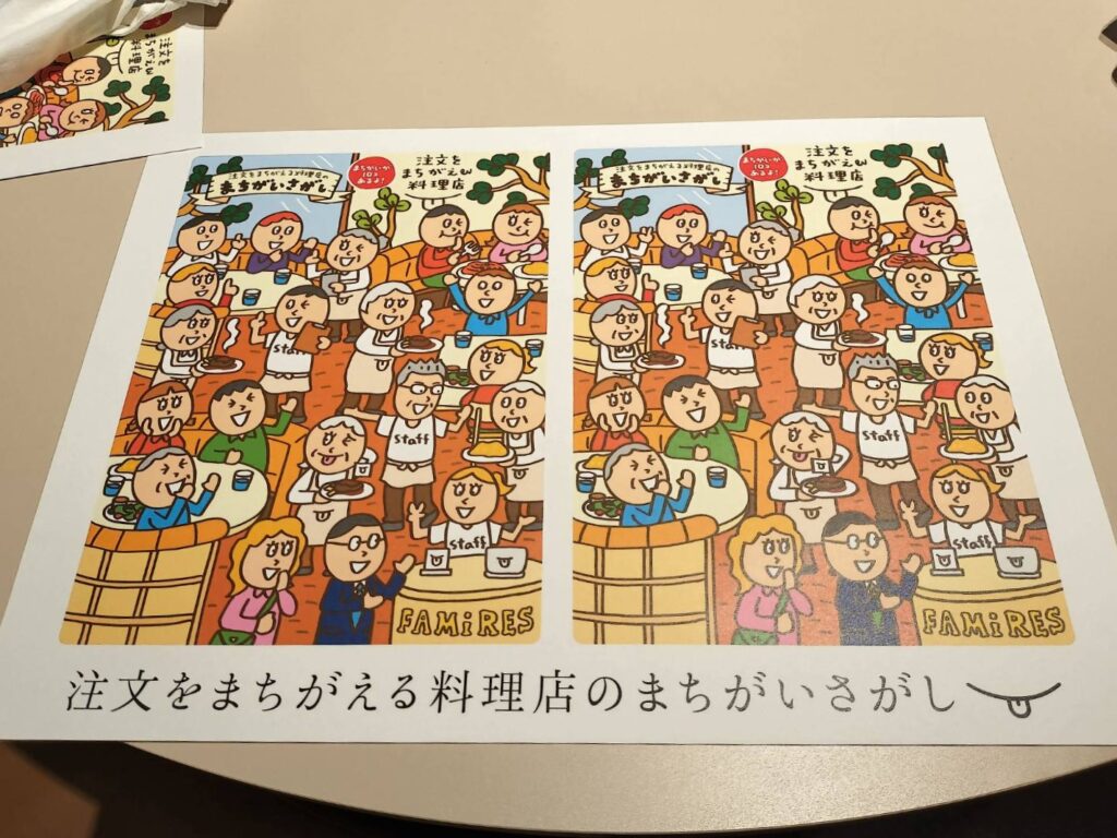“ま、いっか” と自然に笑い合う、あたたかな時間にコース料理が振舞われ、料理店のランチョンマットにまちがいさがしを描きました。
