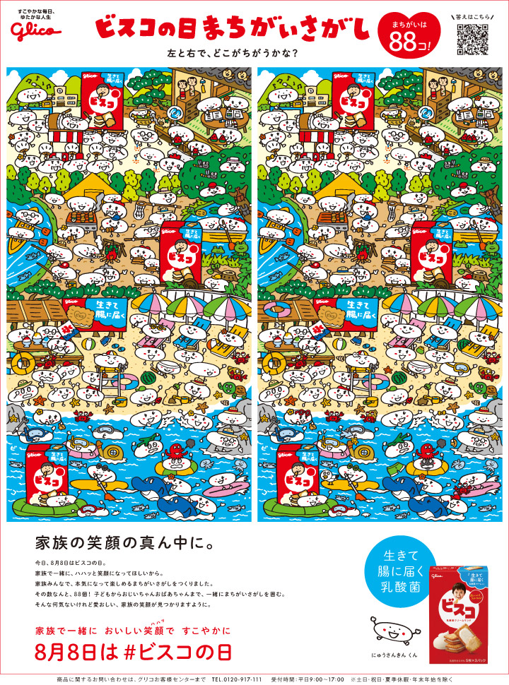 「ビスコ」発売90周年を記念して制定された“ビスコの日”(8月8日)に合わせ、新聞全ページを使った88個の「まちがいさがし」広告が掲載される。家族で楽しめる企画として展開されたこの広告にて、紙面ビジュアルを担当。