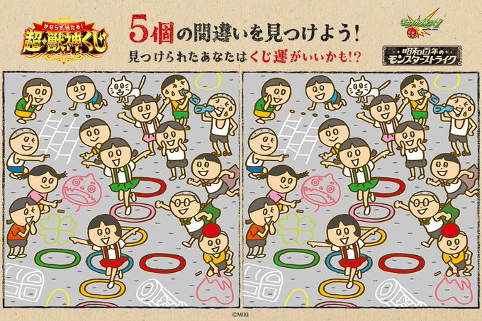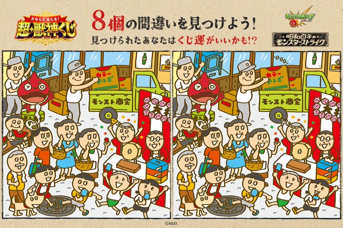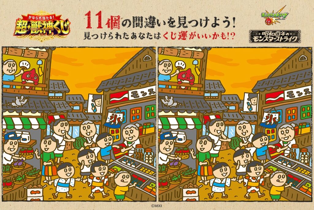 モンスト夏のキャンペーン「昭和百年のモンスターストライク」の懐かしい昭和の風景が描かれたまちがいさがし。